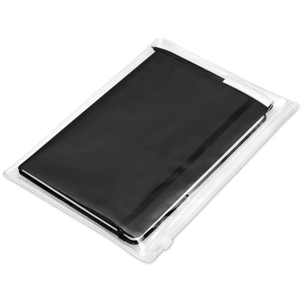 - The set includes a notebook and pen with matching matte textures and white accents, presented in a reusable PVC pouch with a ziplock closure. The pouch measures 25.5 (l) x 17.5 (w) x 1.2 (h) cm.
