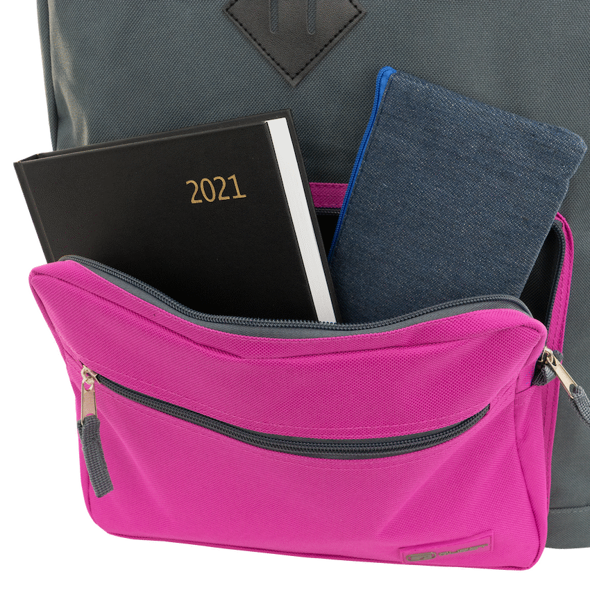 - This Quest brand school backpack features a distinctive dark grey and pink colour scheme.