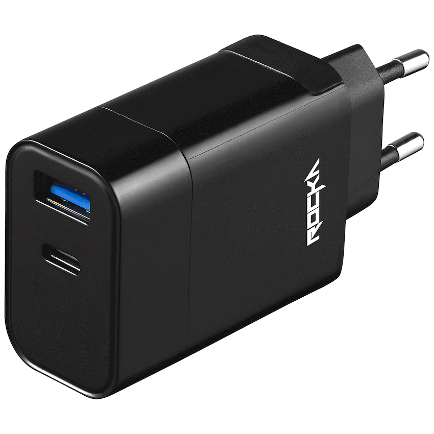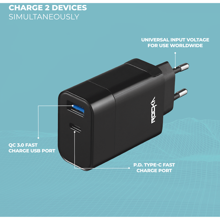 Keep your mobile devices charged quickly with the Rocka Rapid Series 18W Wall Charger. It features USB Type-A QC3.0 and USB Type-C PD ports, allowing fast charging for two devices simultaneously. This charger represents Rocka’s dedication to dependable power products.