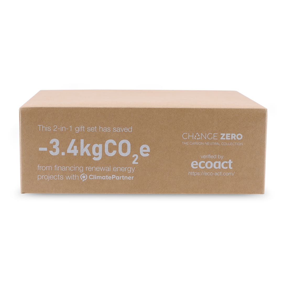 - Each set comes in a sustainable, recyclable kraft box, making it a carbon-zero promotional gift with a measured and offset carbon footprint of -3.4 kgCO2eq per unit.