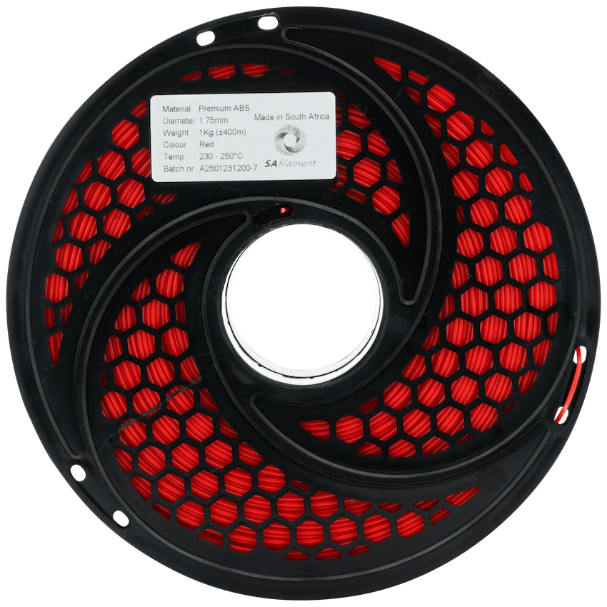 - This red ABS filament is locally engineered and manufactured in South Africa, with each spool containing 1kg of material.