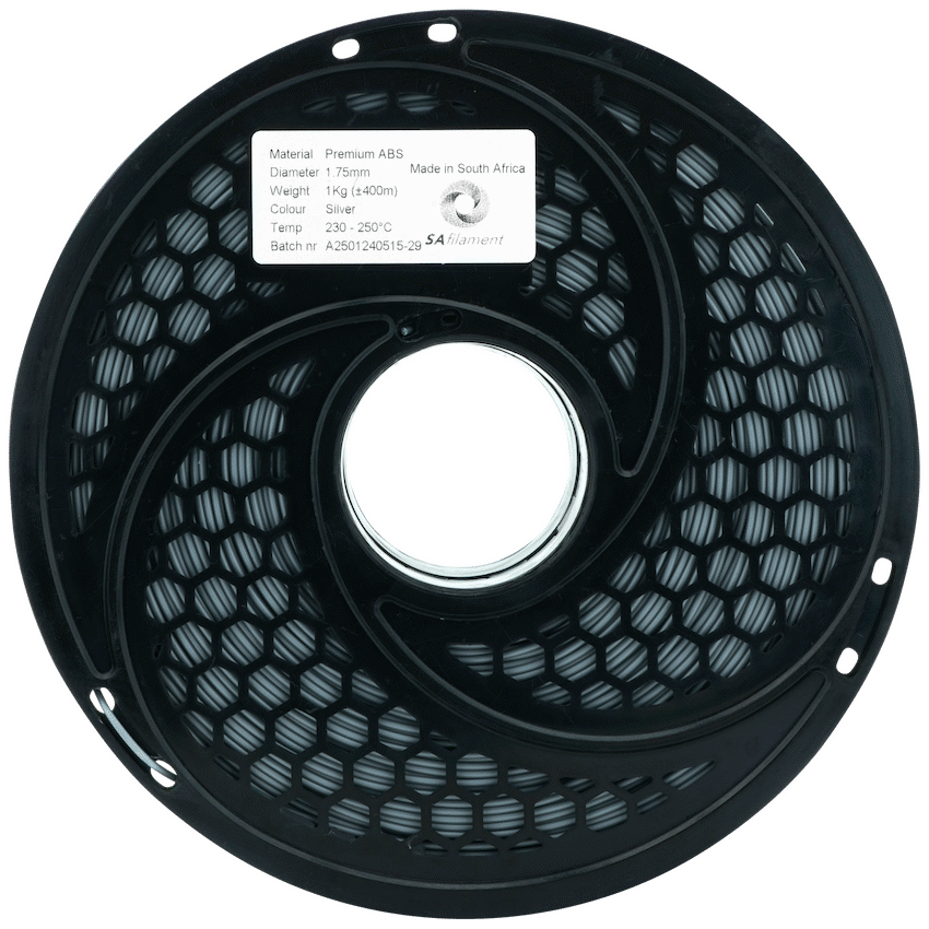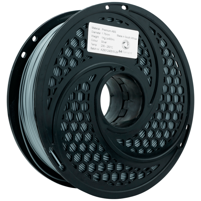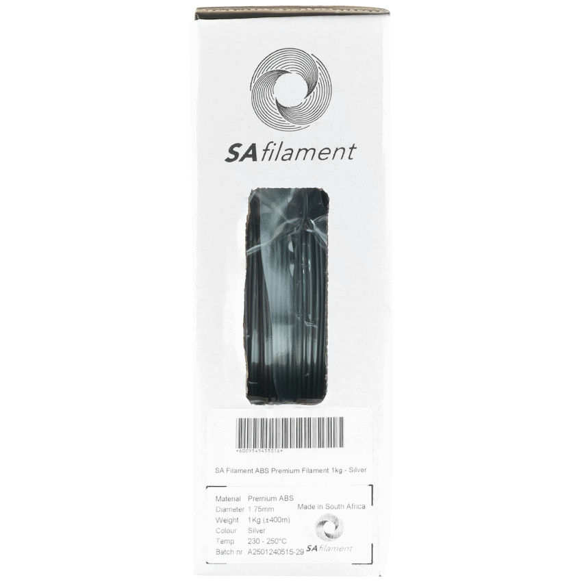 Produce strong, heat-resistant 3D prints with SA Filament ABS Premium Silver. This 1kg, 1.75mm filament ensures consistent extrusion for accurate functional parts and prototypes. It is proudly manufactured in South Africa.