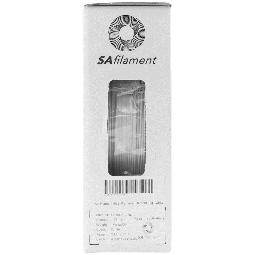 This SA Filament ABS Premium white filament provides dependable material for strong, heat-resistant 3D prints. Each 1.75mm, 1kg spool is vacuum-sealed for quality. It is proudly manufactured in South Africa for consistent results.