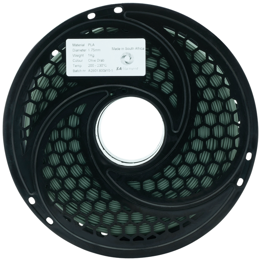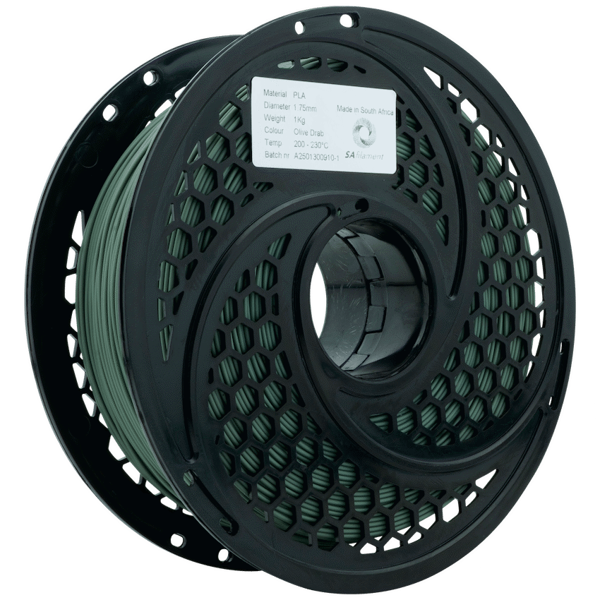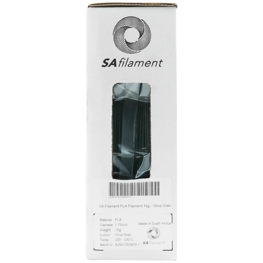 Print reliably and eco-consciously for general projects using SA Filament Olive Drab PLA. This biodegradable material, derived from renewable resources, features a 1.75 mm diameter with tight +/-0.05 mm tolerances. It is locally manufactured in South Africa by SA Filament.
