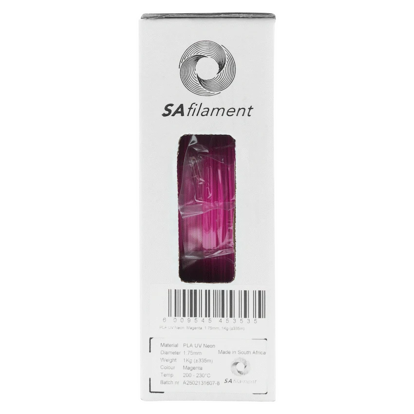 Create striking 3D prints with SA Filament’s UV Neon Magenta PLA. This 1kg spool of biodegradable 1.75mm filament offers smooth extrusion and consistent layer adhesion, making your promotional items and prototypes visually appealing. It is a reliable choice from SA Filament.