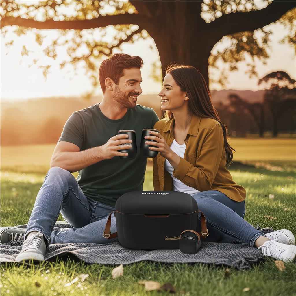 Enjoy refreshment and audio with the Serendipio Hampstead Gift Set. This set features a 12-litre cooler box, two 350ml double-wall tumblers for hot or cold drinks, and a 5W mini-Bluetooth speaker. It is a well-rounded Serendipio collection.