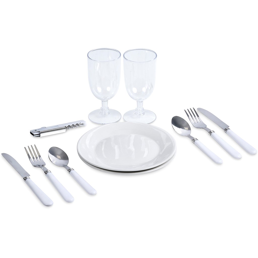 - The set includes two stainless steel knives, forks, and spoons with PP handles, two ceramic plates, two plastic wine glasses, and a corkscrew.