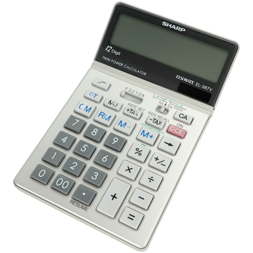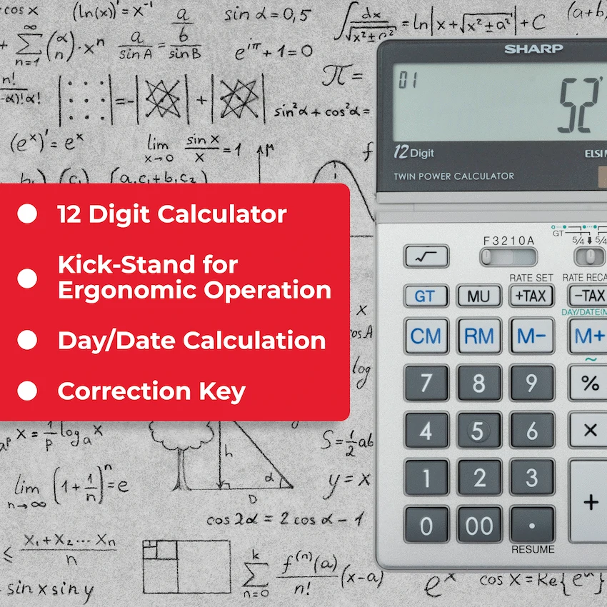 Get essential calculations done with the Sharp EL387V multi-function calculator. It features an extra-large 12-digit tilt display for clear viewing. Practical functions include tax, day/date calculations, and a line counter, making it suitable for any office or study.