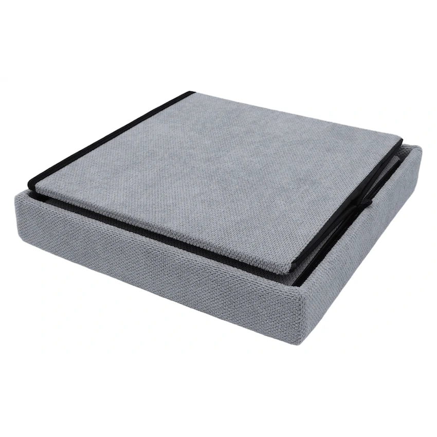 - It features a removable upholstered lid, often made from durable polyester fabric, which conceals