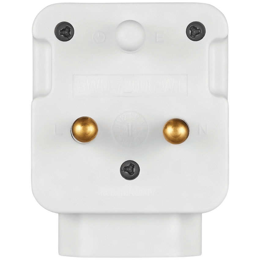 This Switched 2-Way Schuko Adaptor helps connect imported electrical devices in South Africa. It features top and bottom loading sockets for one 10A Schuko and one 5A Euro device, with safety shutters. It handles 250V, 16A, making it a reliable choice for South African power needs.