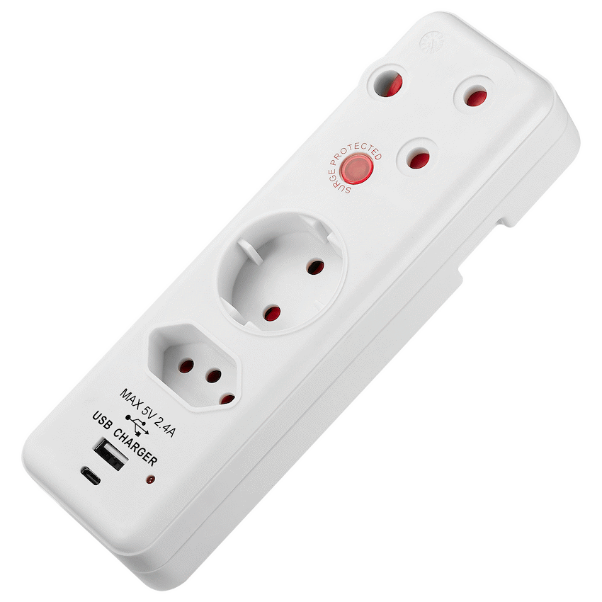 Switched 3-Way Medium Surge Adaptor – Schuko with Type-C + USB