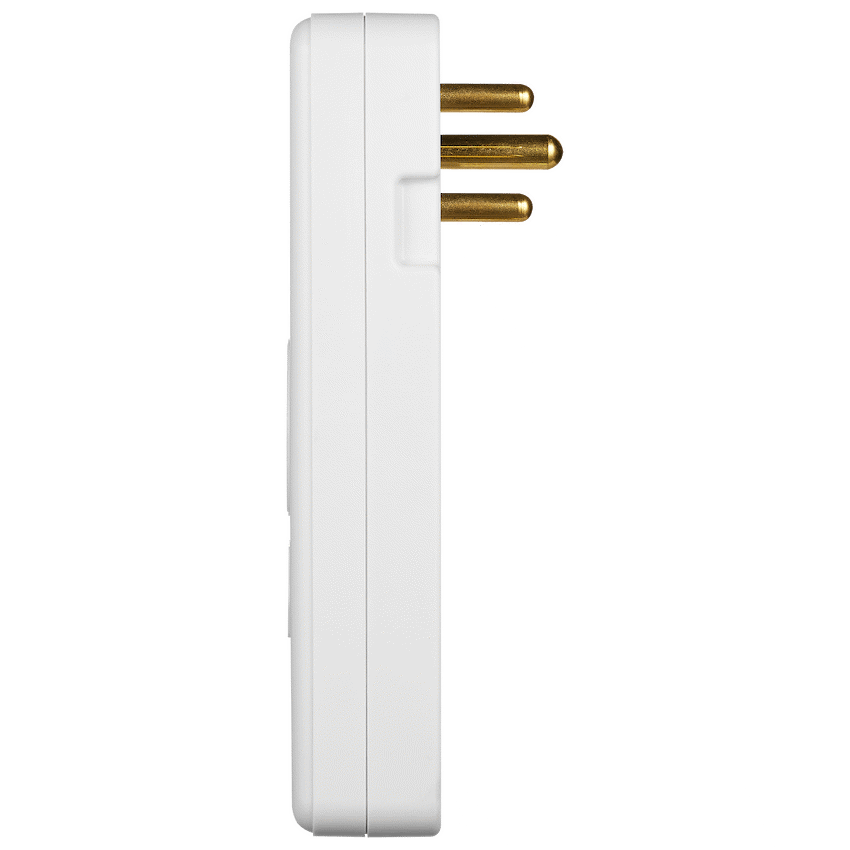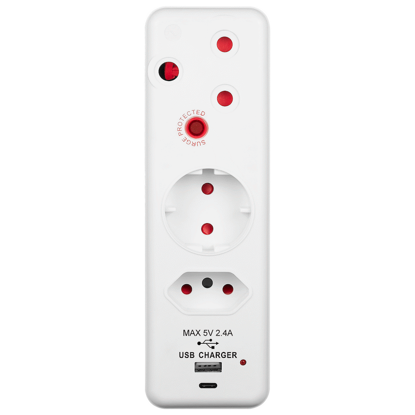 Protect multiple devices with the Switched 3-Way Medium Surge Adaptor. It has one 3-pin, one SANS 164-2, and one Schuko socket. Dual USB-A and Type-C ports allow for up to 2.4A charging, making this Switched adaptor useful for home or office.