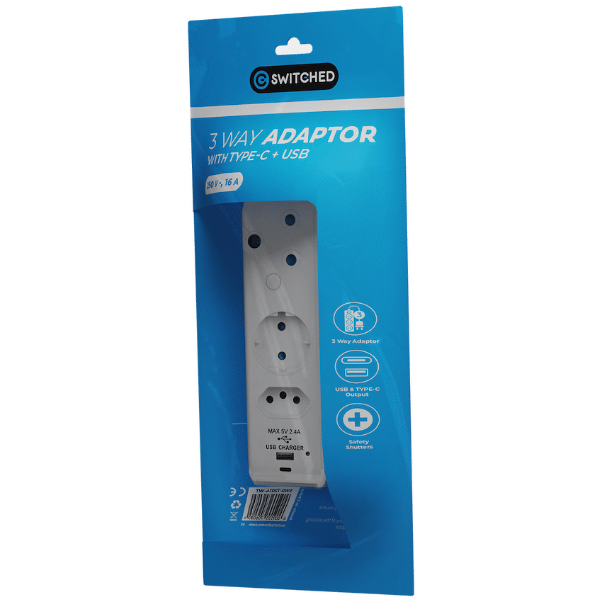 Switched 3-Way Schuko Adaptor with Type C + USB