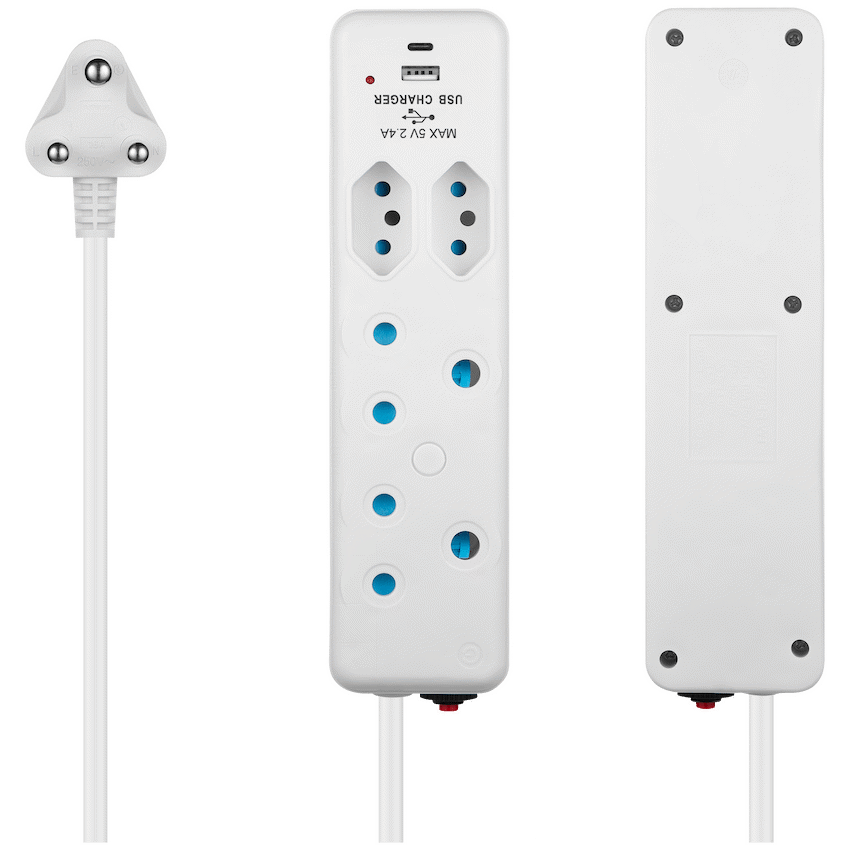 - Provides four standard power sockets along with one Type-C and one USB-A charging port.
