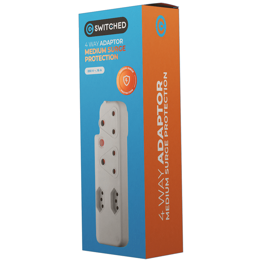 This Switched 4-Way Medium Surge Adaptor protects electronics from power fluctuations and overloads. It offers medium surge protection for up to four appliances, using dual 16A SANS 164-2 sockets. A reliable choice for home and office power safety.