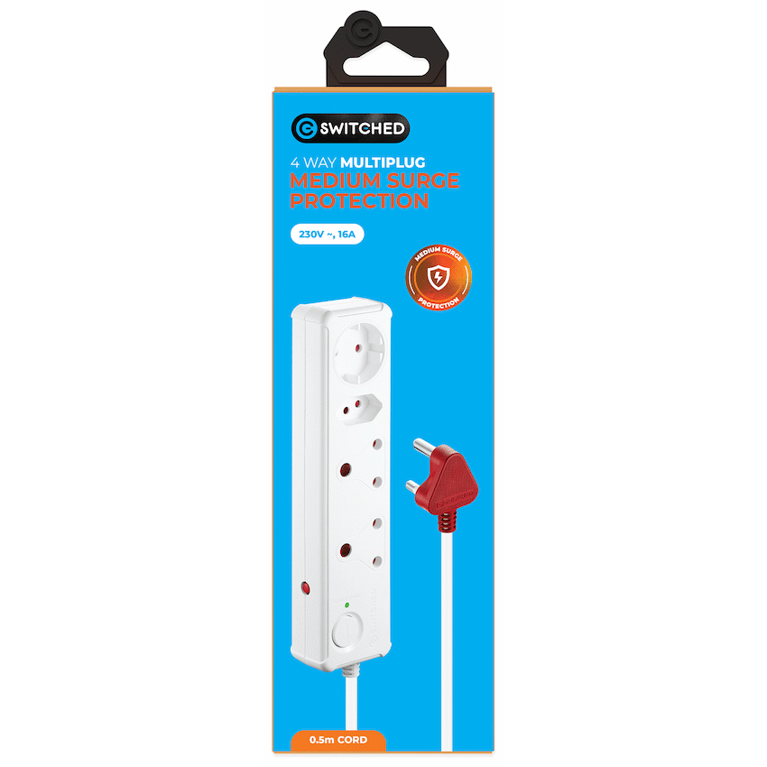 Switched 4-Way Medium Surge-Protected Multiplug 0.5m Cord – White