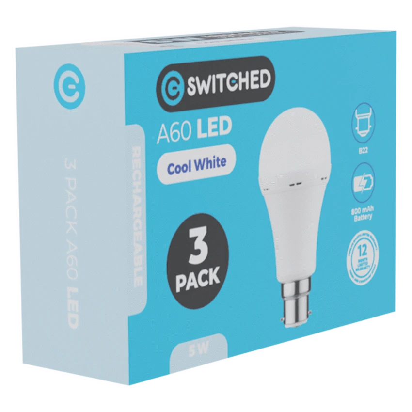Offer a practical general promotional item with the Switched 5W A60 Rechargeable B22 LED Light Bulb 3-Pack, providing reliable light during South African power cuts.