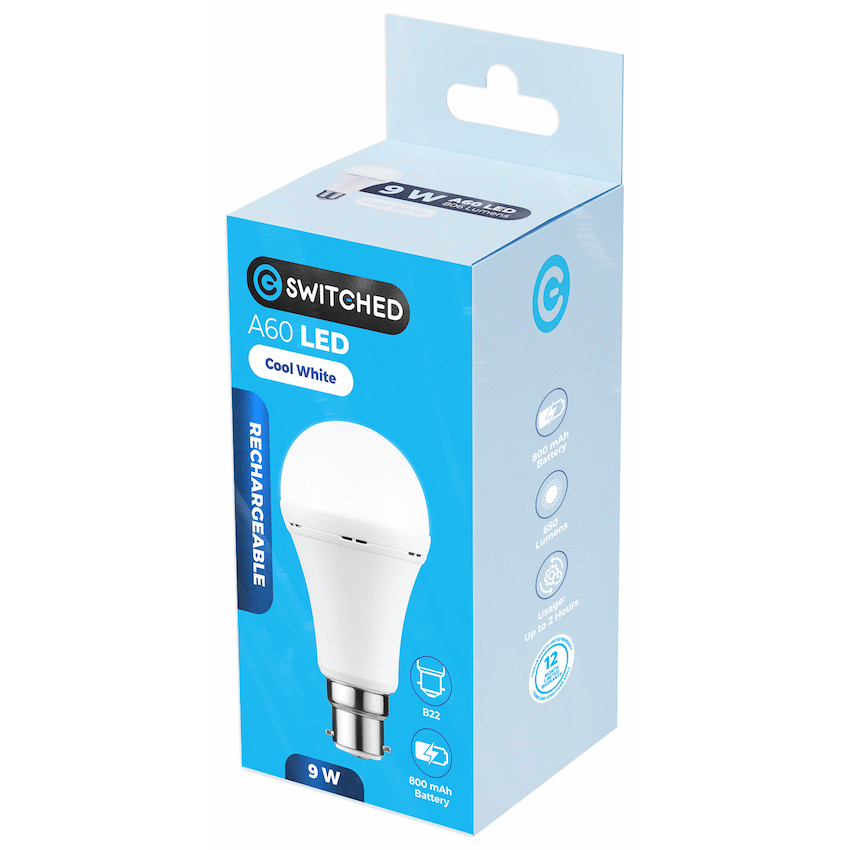 Get dependable cool white light during power cuts or in remote areas with the Switched 9W A60 Rechargeable LED Bulb. Its built-in battery keeps it working when needed. This B22 fitting bulb offers practical, reliable lighting from Switched.