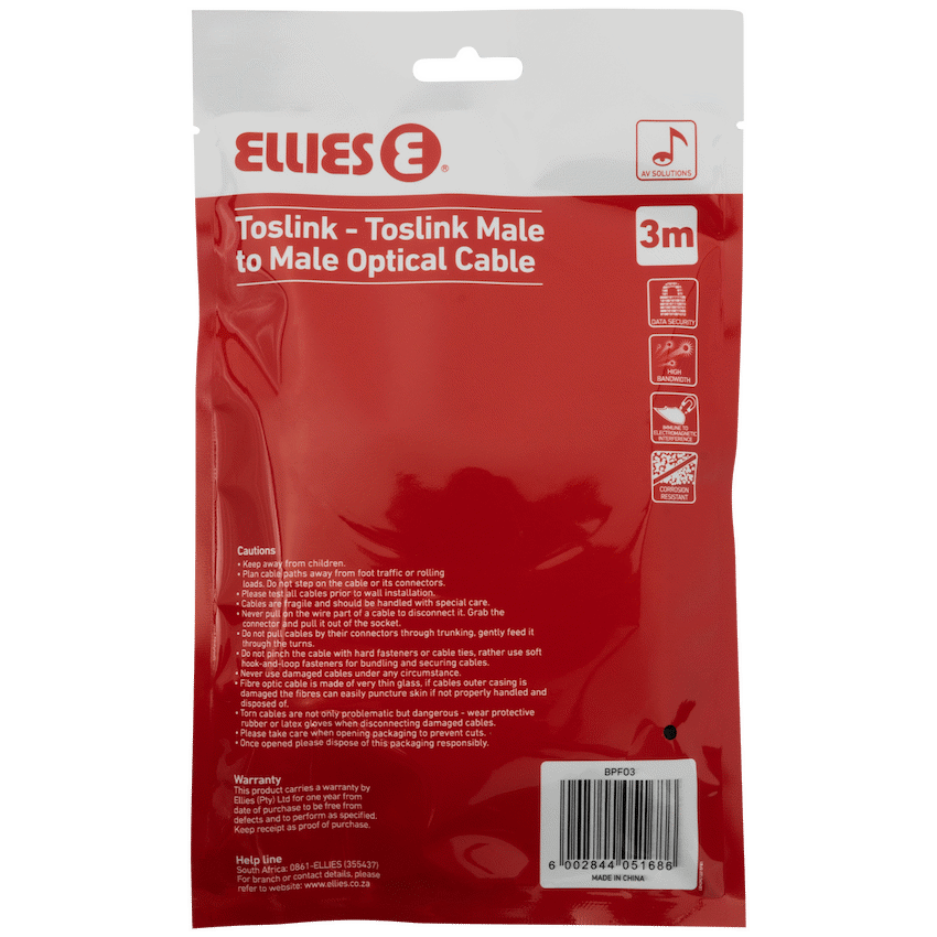 Connect your TV, soundbar, or AV receiver with the Ellies 3m TOSLINK digital audio cable. Its length allows for flexible device placement. Gold-plated connectors help maintain clear audio signals, making this a dependable Ellies accessory.