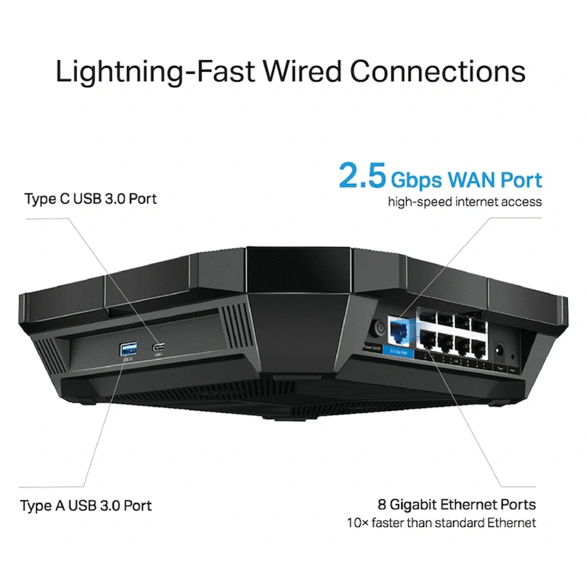 • Connectivity options include one 2.5 Gbps WAN port, eight Gigabit LAN ports, and two USB 3.0 ports (Type A and Type C).