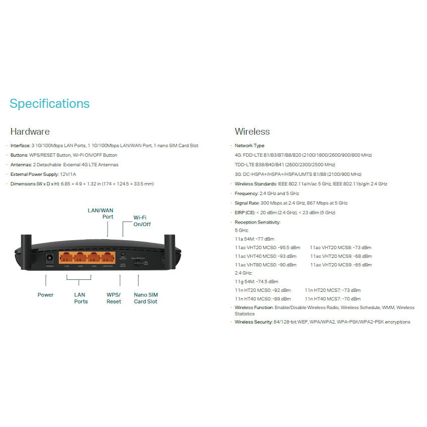 Get widespread internet access with the TP-Link Archer MR400 4G LTE Router. It shares 4G LTE internet with up to 64 Wi-Fi devices, offering download speeds up to 150 Mbps. Simply insert a micro SIM card for instant dual-band Wi-Fi. This is a reliable TP-Link device.