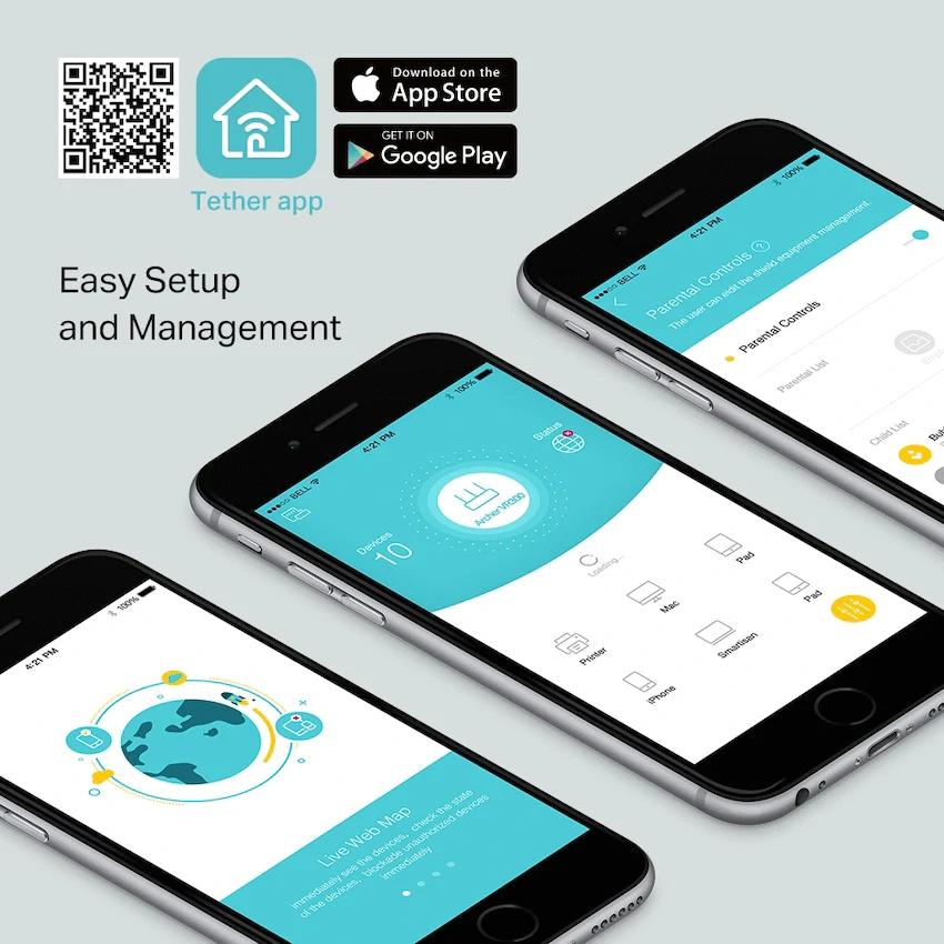 - **Easy Management:** Set up and manage network settings, including Parental Controls and Guest Network, using a web interface or the TP-Link Tether app.