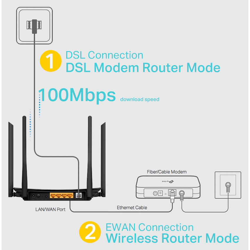 Get reliable internet with the TP-Link Archer VR300 AC1200 Wi-Fi VDSL/ADSL Modem Router. This device combines a modem and router, simplifying network setup. It offers dual-band Wi-Fi up to 1200Mbps and supports VDSL broadband up to 100Mbps from TP-Link.