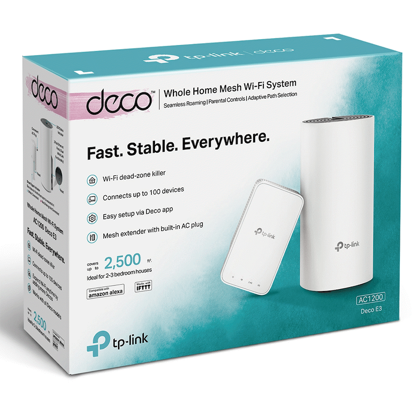 Enjoy dependable Wi-Fi coverage throughout your home with the TP-Link Deco E3 AC1200 Mesh Wi-Fi System. This two-pack system, with a router and extender, provides coverage up to 2,400 square feet. TP-Link delivers trusted network solutions.