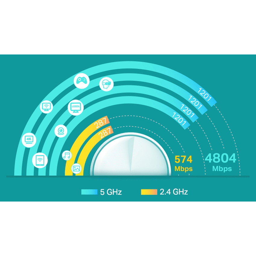 - This tri-band system provides Wi-Fi 6 speeds up to 5,400 Mbps, with 4,804 Mbps on 5 GHz and 574 Mbps on 2.4 GHz for quick data transfer.