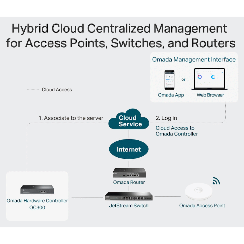 - Manages up to 500 Omada access points, JetStream switches, and SafeStream routers from one place.