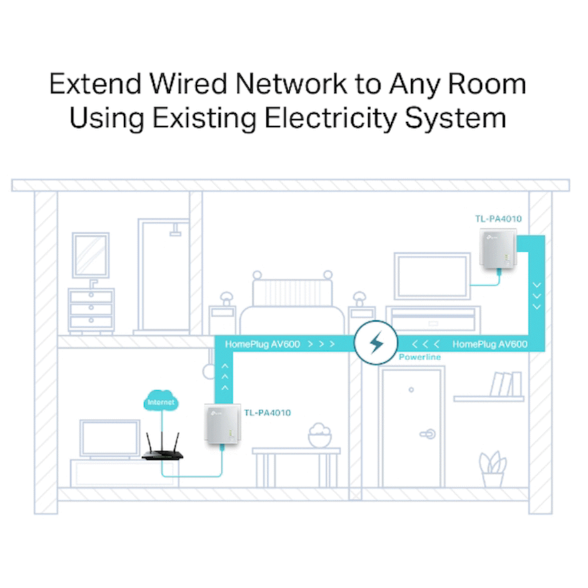 Extend your wired internet reliably with the TP-Link PA4010-KIT. It uses HomePlug AV technology to deliver up to 500Mbps over your home’s electrical wiring. Each compact adapter plugs into any power socket, making network expansion simple with TP-Link.