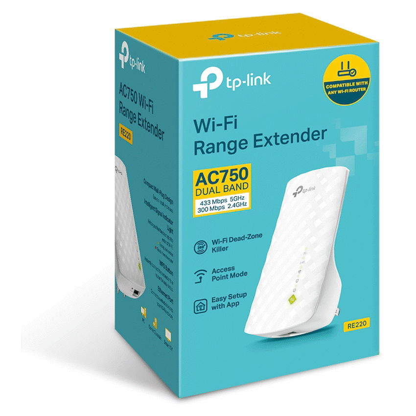 Extend your home Wi-Fi signal with the TP-Link RE220 AC750 Range Extender. It boosts existing Wi-Fi with dual-band speeds up to 750Mbps, removing dead zones. This extender works with any standard router, making it a practical TP-Link addition for better coverage.