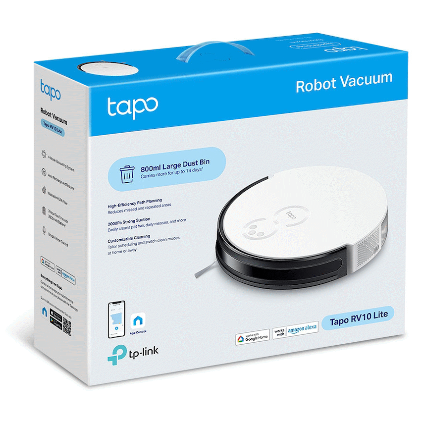 Enjoy automated cleaning convenience with the TP-Link Tapo RV10 Lite Robot Vacuum Cleaner. It features an 800ml dustbin and 2000Pa strong suction for thorough floor cleaning. Trust TP-Link Tapo for dependable home care.