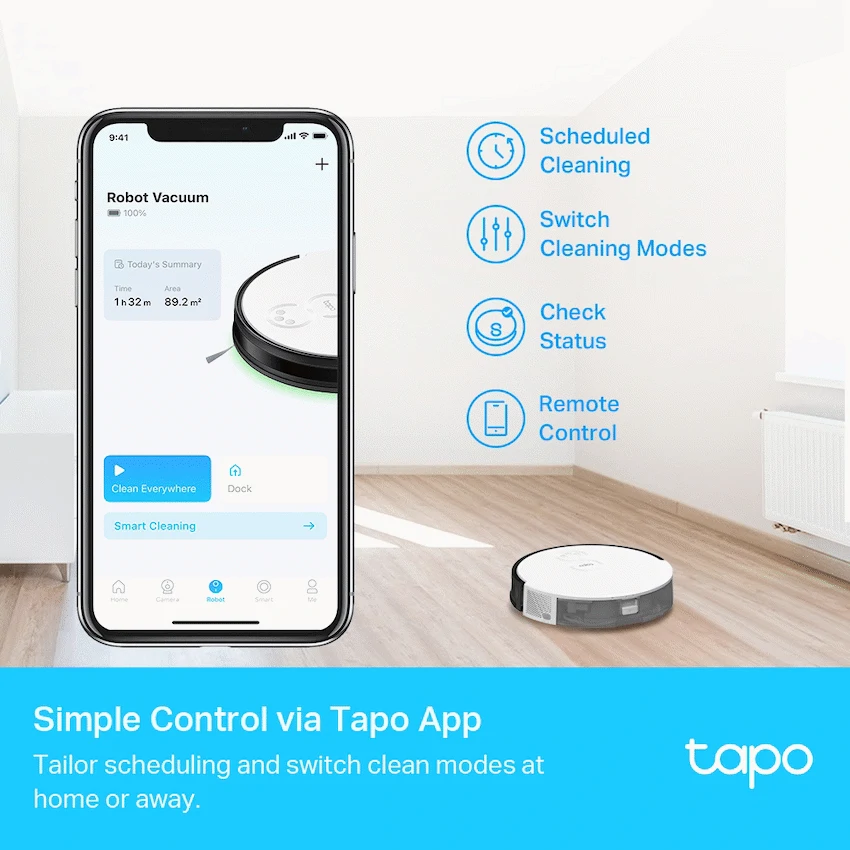 - Control the unit easily via the Tapo App for scheduling and mode changes, including auto-charging and a carpet auto-boost function.