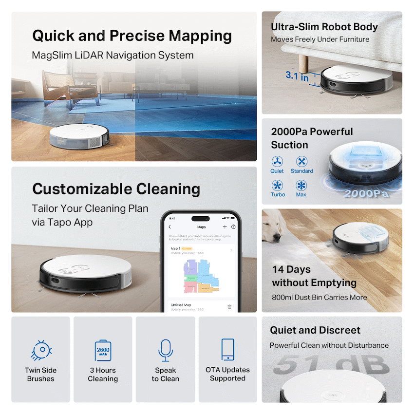 The TP-Link Tapo RV20 Robot LIDAR Vacuum makes home cleaning easy. It uses MagSlim™ LiDAR Navigation for accurate mapping and comprehensive coverage. Its 7.9 cm slim build cleans under low furniture. Experience reliable cleaning with TP-Link Tapo.