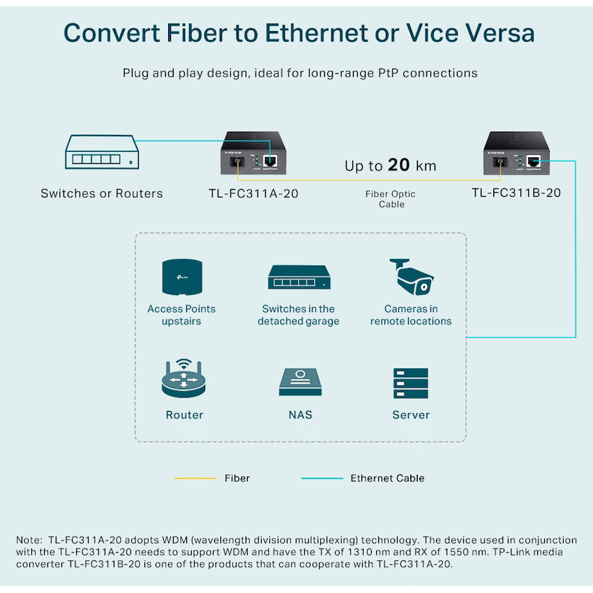 Extend your network’s fibre optic reach with the TP-Link TL-FC311A-20 Gigabit WDM Media Converter. It converts electrical signals to optical, supporting Gigabit speeds over a single fibre for up to 20 kilometres. This is a dependable TP-Link networking component.