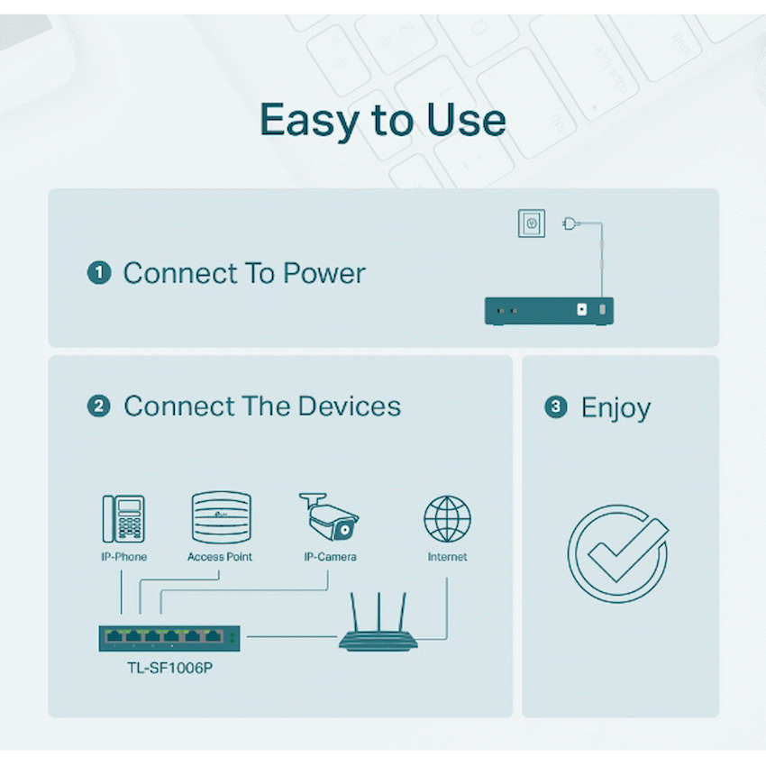 Get reliable network connectivity and power with the TP-Link TL-SF1006P switch. It has four PoE+ ports with a 67W power budget, allowing easy device connection. This TP-Link switch offers simple plug-and-play operation for your network needs.