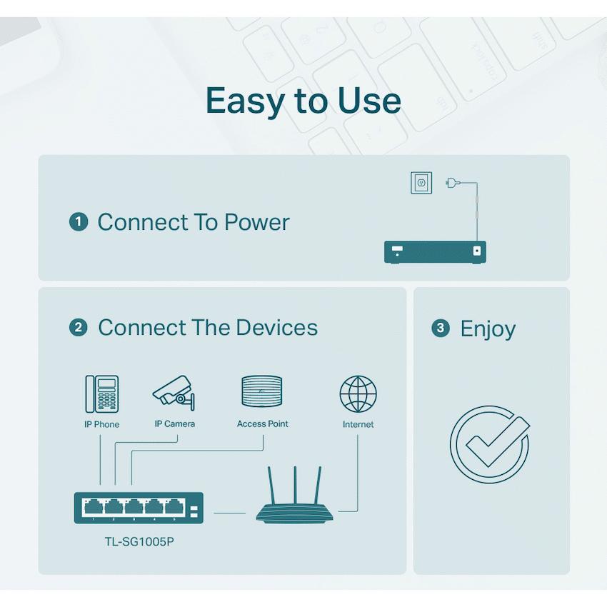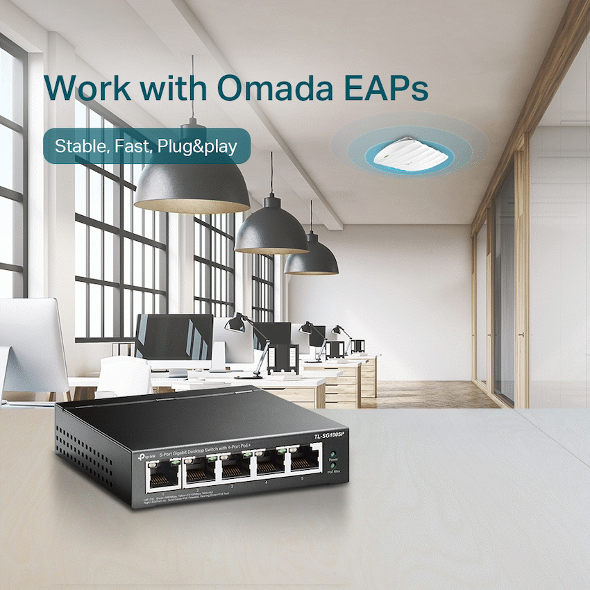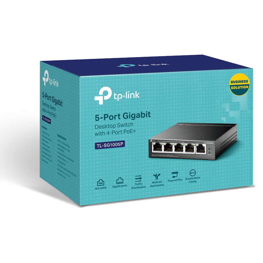 Expand your office network simply with the TP-Link TL-SG1005P 5-Port Gigabit Desktop Switch. It provides data and power through a single cable using four PoE+ ports, with a 56W total budget. This makes network setup straightforward, backed by TP-Link’s dependable performance.