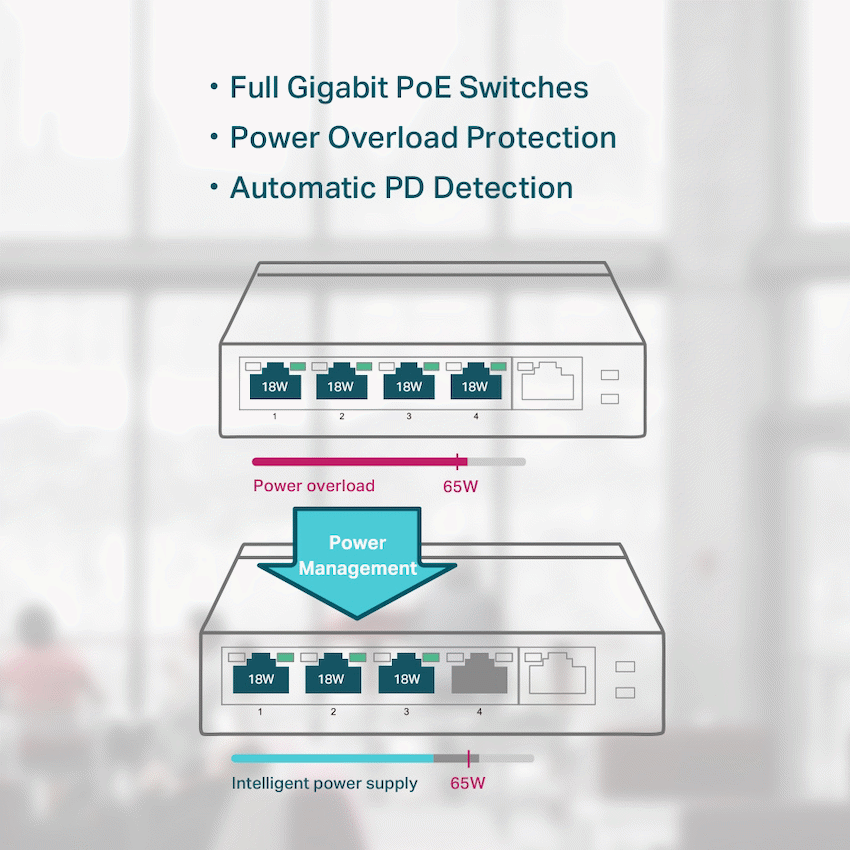 - Supplies up to 15.4W of PoE power per port, with a total PoE power budget of 56W for all four ports.