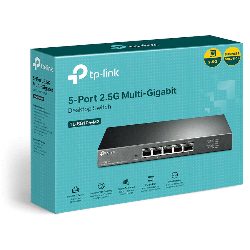 The TP-Link TL-SG105-M2 switch allows fast network connections for your business. It features five 2.5-Gigabit ports, providing quick data transfer for devices like servers and WiFi 6 access points. This desktop switch makes network upgrades simple and reliable.