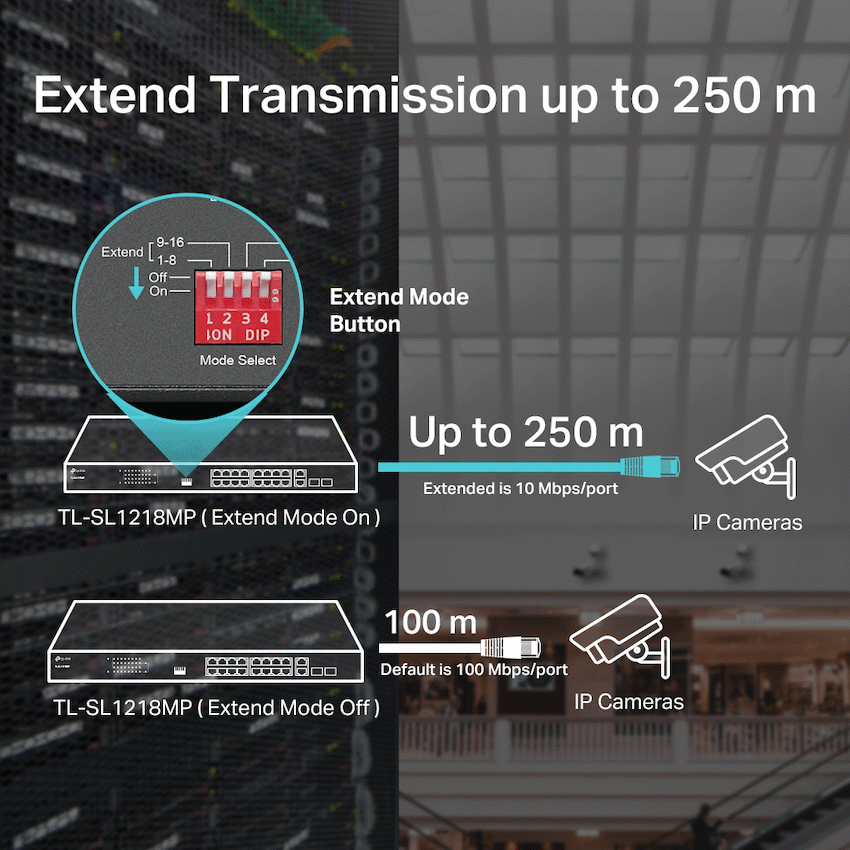 - Features an Extend Mode for data and power transmission up to 250 metres, useful for long-distance surveillance setups.