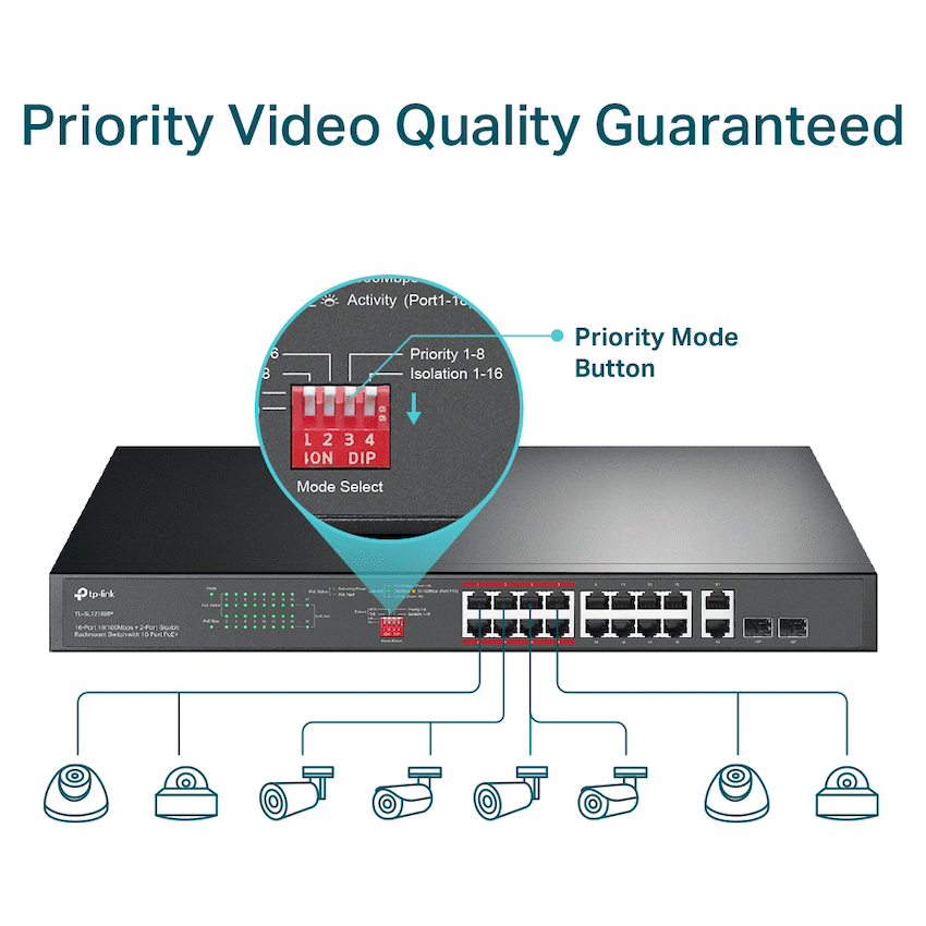 - Equipped with 16 PoE+ RJ45 ports and a total PoE power budget of 250W, allowing power and data to devices like IP cameras.