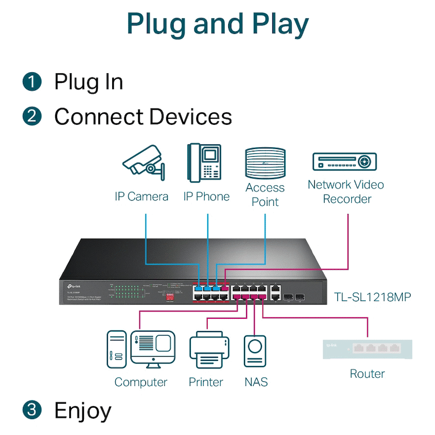 This TP-Link TL-SL1218MP network switch is a practical general promotional item for businesses needing reliable network infrastructure. It offers comprehensive power and data connectivity for various devices.