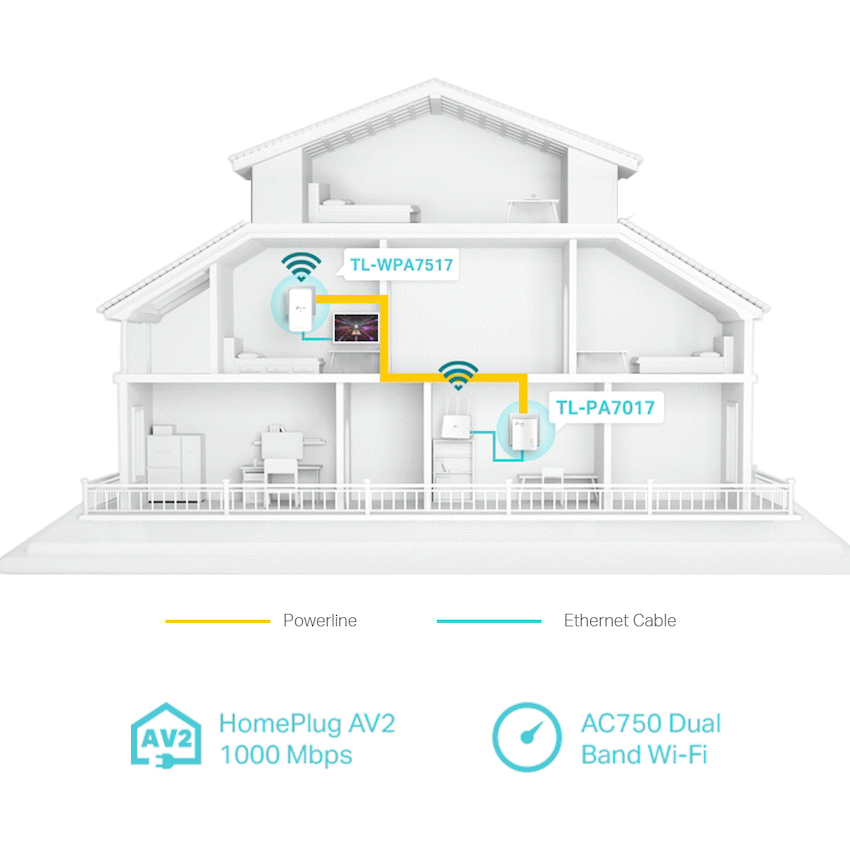 Extend stable internet across your property with the TP-Link TL-WPA7517 AV1000 Powerline Wi-Fi Kit. It uses Homeplug AV2 for 1000 Mbps data over 300 metres and provides dual-band AC750 Wi-Fi. This kit helps broaden your TP-Link network.