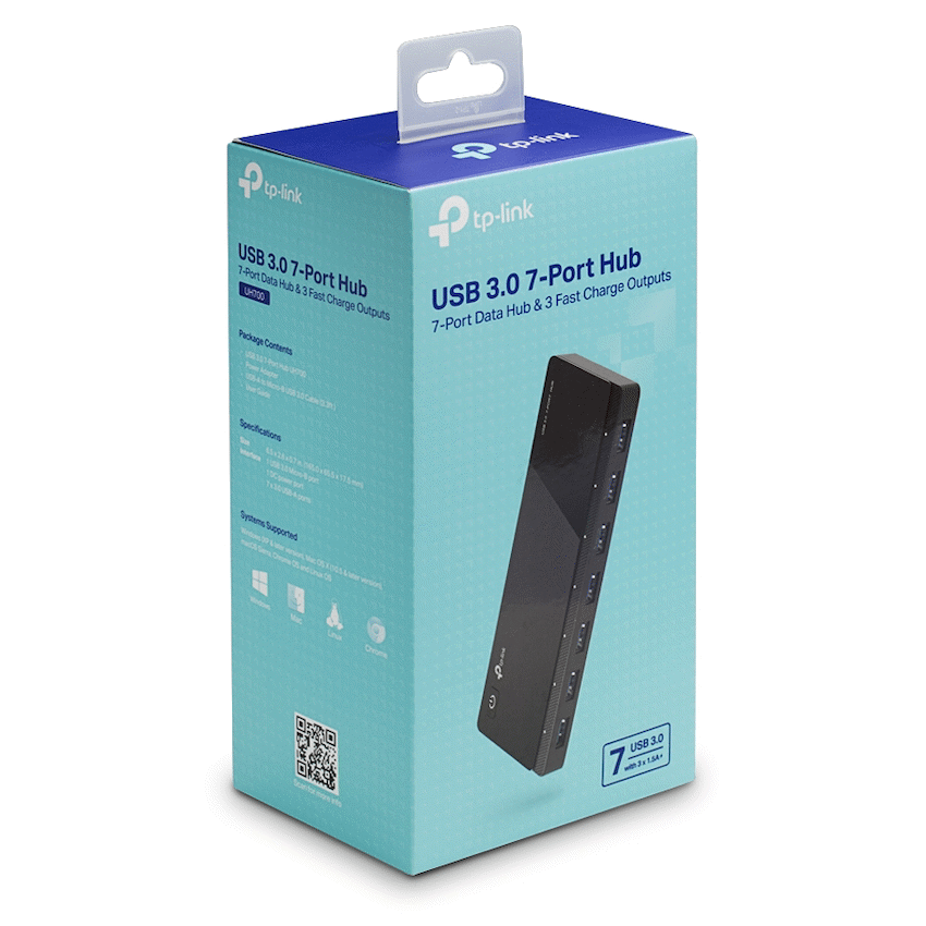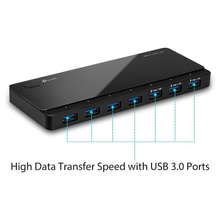 Connect and charge multiple devices easily with the TP-Link UH700 USB 3.0 7-Port Hub. It offers seven USB 3.0 data ports and two dedicated 2.4A charging ports, allowing 5 Gbps data transfers. This TP-Link hub provides reliable connectivity.