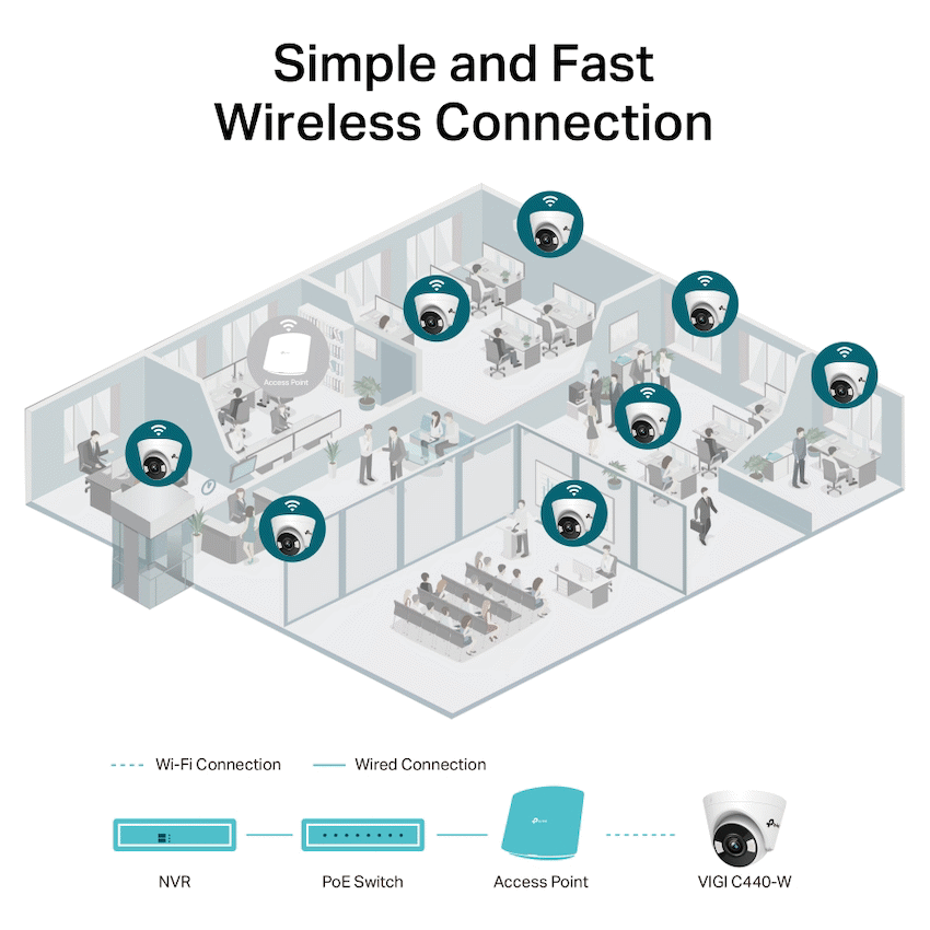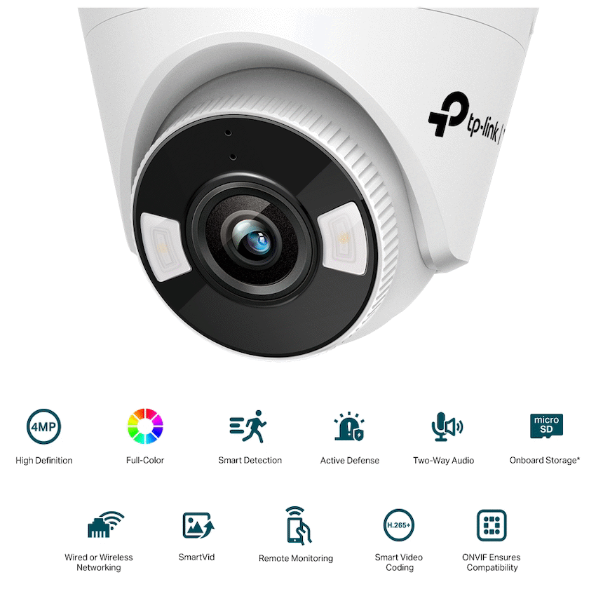Keep your property safe with the TP-Link Vigi C440-W Wi-Fi Turret Camera. It records 4MP ultra-high definition video and provides 24-hour full-colour imaging, even in low light, thanks to its sensitive sensor and spotlights. This camera offers reliable security monitoring from TP-Link.