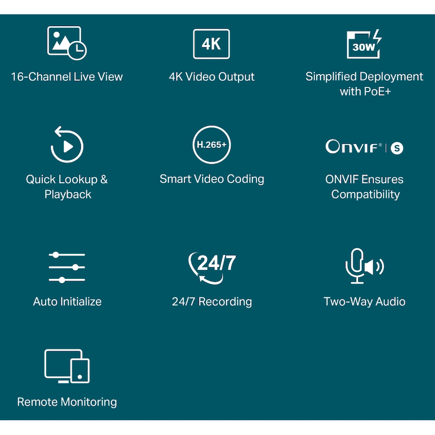 The TP-Link Vigi NVR2016H-16MP 16 Channel PoE+ Network Video Recorder offers a reliable system for corporate video surveillance and security monitoring.