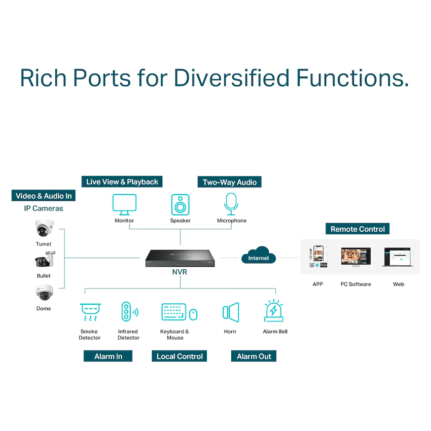 - Supports up to 32 cameras with a 320 Mbps incoming and outgoing bandwidth, making sure of stable video recording.