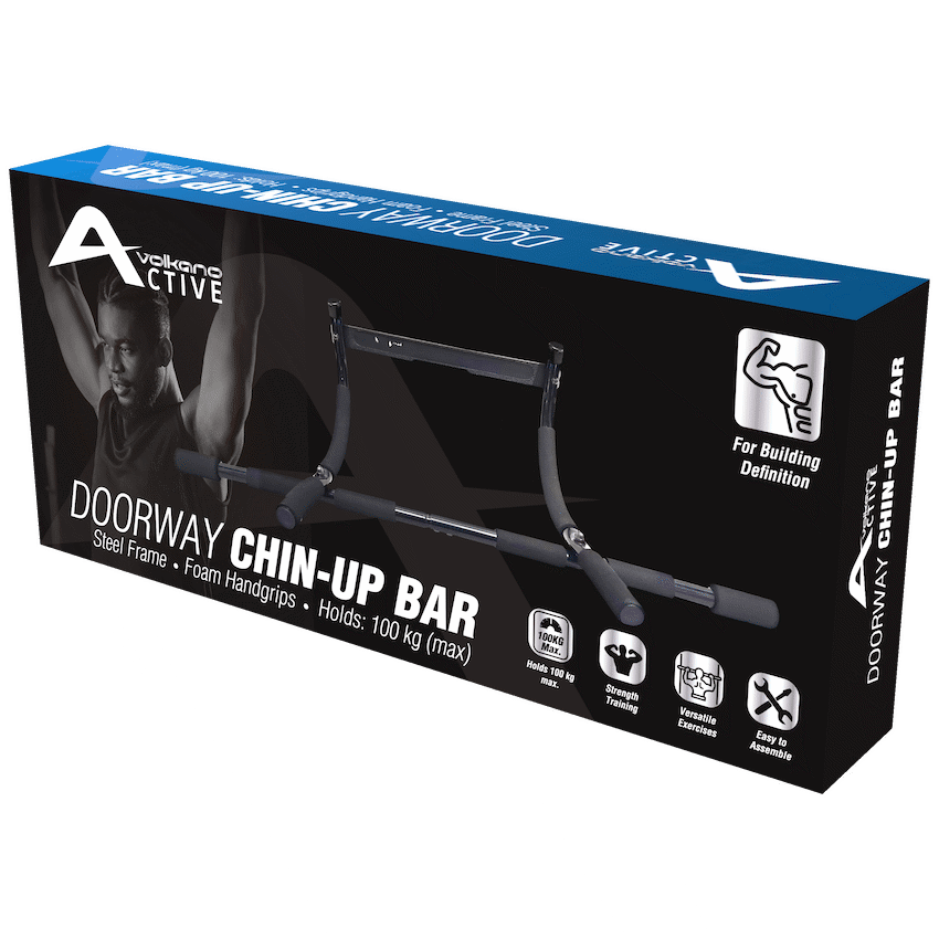 - This Volkano Active Doorway Chin-Up Bar allows for convenient upper body strength training at home.