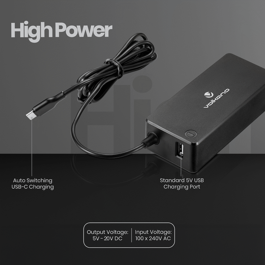 Keep laptops and devices powered reliably with the Volkano Brio Plus Series 65W USB-C charger. It offers fast charging via its USB-C port and includes a USB-A port for simultaneous accessory charging. This makes it a practical Volkano power solution.
